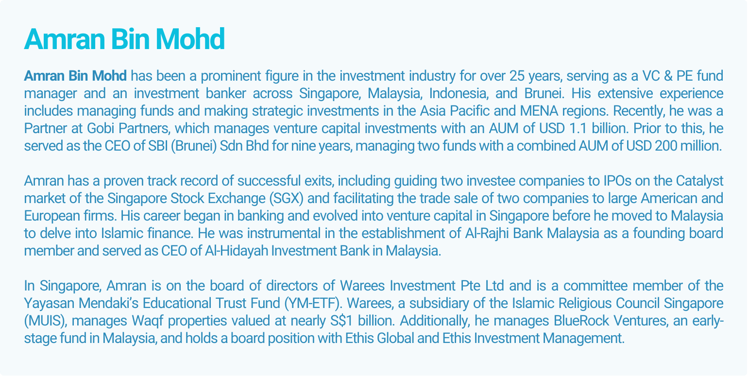 • Founding board member of Al-Rajhi Bank Malaysia, managing BlueRock Ventures and serving on boards including Warees Investment and Ethis Global